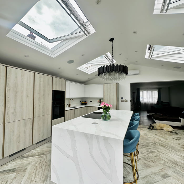 You will have the opportunity to choose (subject to planning consent) from a pitched roof, sloped roof or flat roof extension. With endless possibilities and varieties for the glazing options. Skylights, Velux windows, four glass roofs or fixed roof lights, you can design your dream kitchen. You will have the option to choose from our sliding doors, bi-fold doors, heritage doors or crittal style or sliding doors. At Herko everything you need is in one space, so you will not have to worry about measuring, looking or installing any of the items.