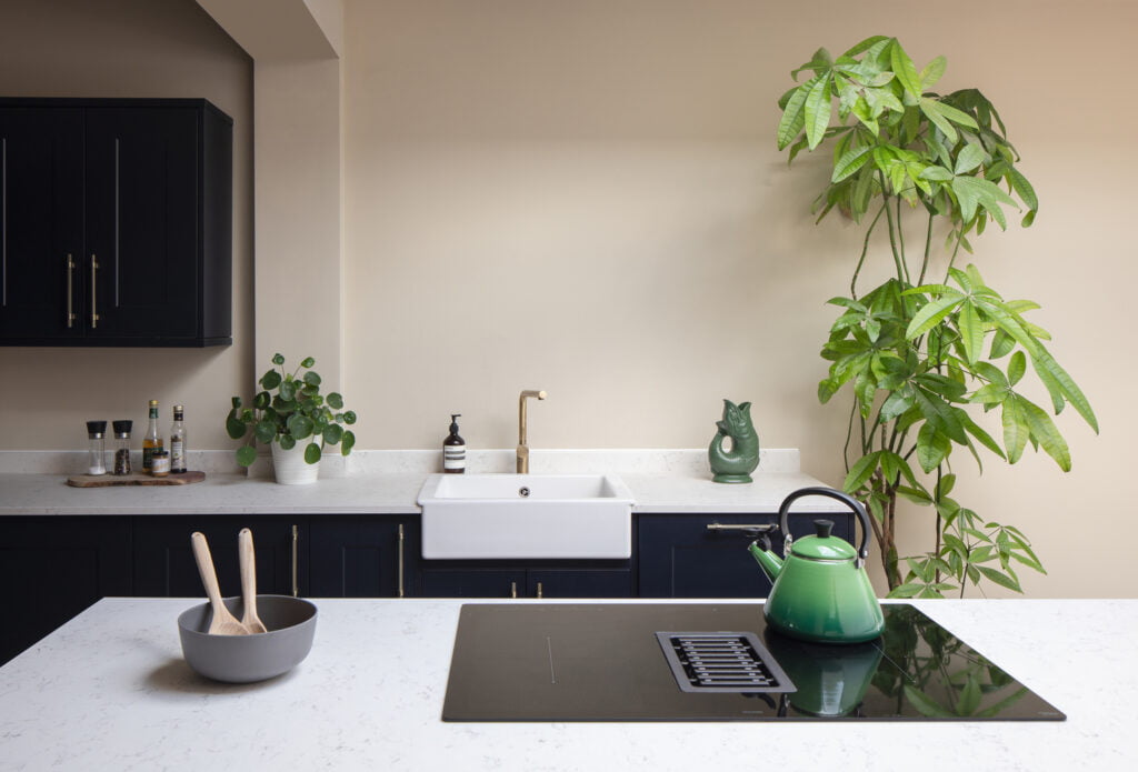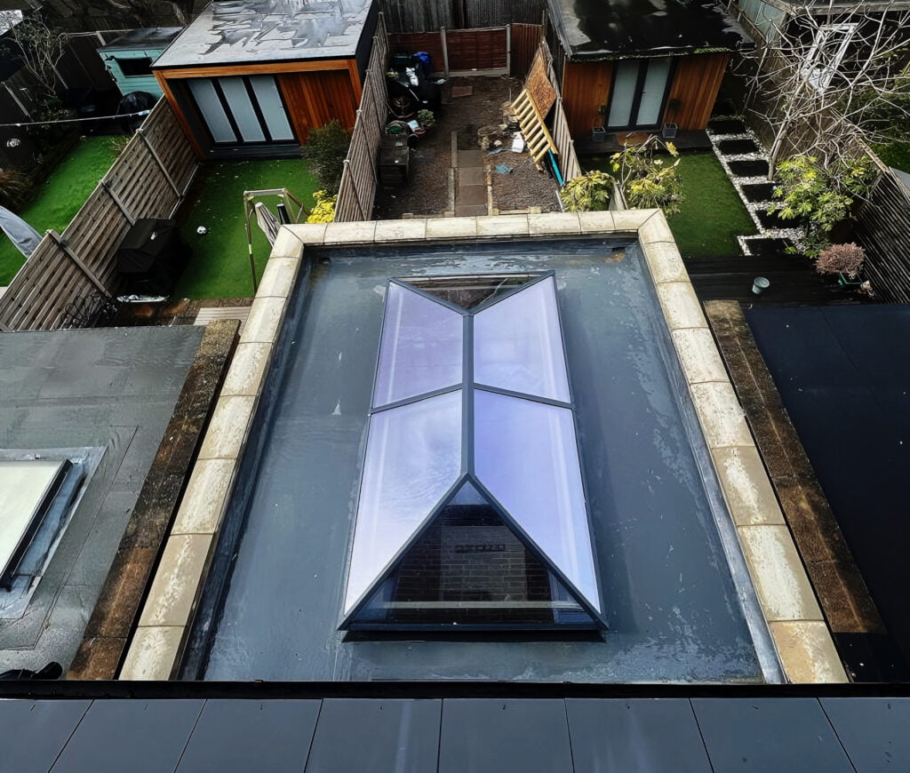 Extension created a large kitchen space and diner, client wanted to maximise natural light so we decided to install a large roof lantern to match with the rear heritage door.